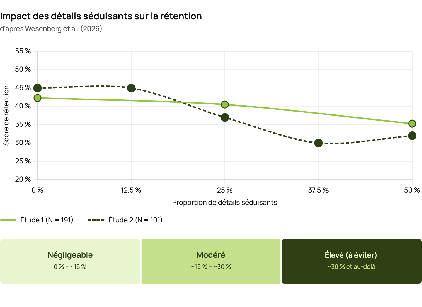 C’est précisément la question qu’a posée une équipe de recherche allemande dans deux études menées auprès de 292 personnes étudiantes. Les sujets ont reçu un texte d’apprentissage enrichi d’une proportion variable de détails séduisants – de 0 % à 50 % du contenu principal – le nombre d’interruptions restant constant. Deux indicateurs ont été mesurés : la rétention (mémorisation des informations) et le transfert (capacité à appliquer des connaissances).